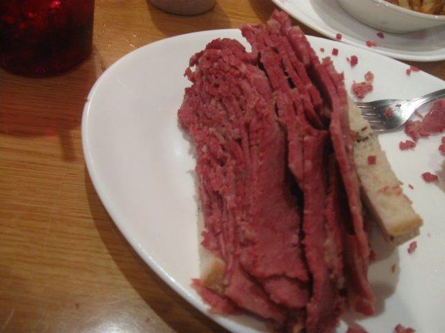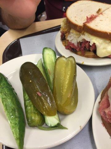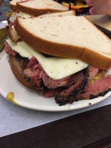El restaurante es un local muy grande con una barra enorme como de charcutería con el embutido en ella y donde se pide lo que quieres comer. Todas las paredes están decoradas con fotos de famosos que han ido a probar el famosísimo sándwich. También son típicos los pepinillos. El pastrami es una carne roja, normalmente ternera, preparada en salazón con varias especias, cuyo origen parece situarse en las comunidades judías de Rumanía. Aquí se puede comer el hot pastrami o tomarlo frío, con pan de centeno y mostaza. Muy rico. A veces puede ser un poco agobiante por la cantidad de gente que hay, pero suelen ser bastante rápidos.