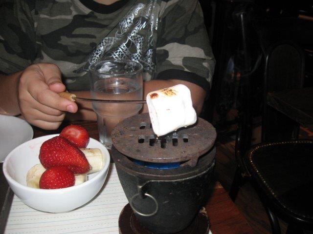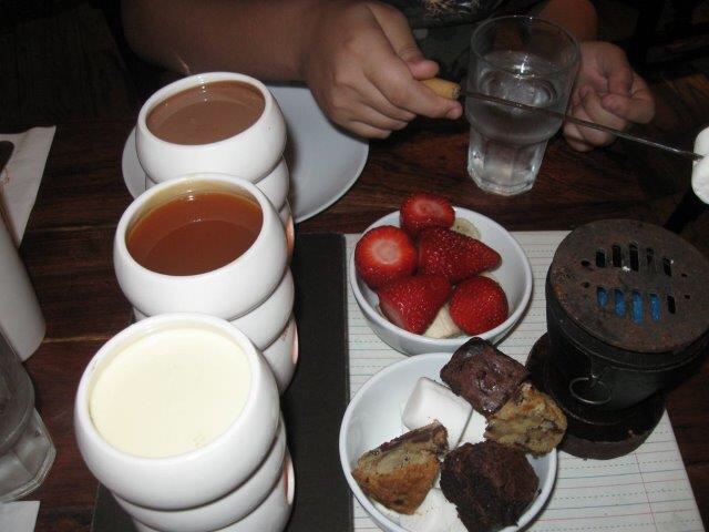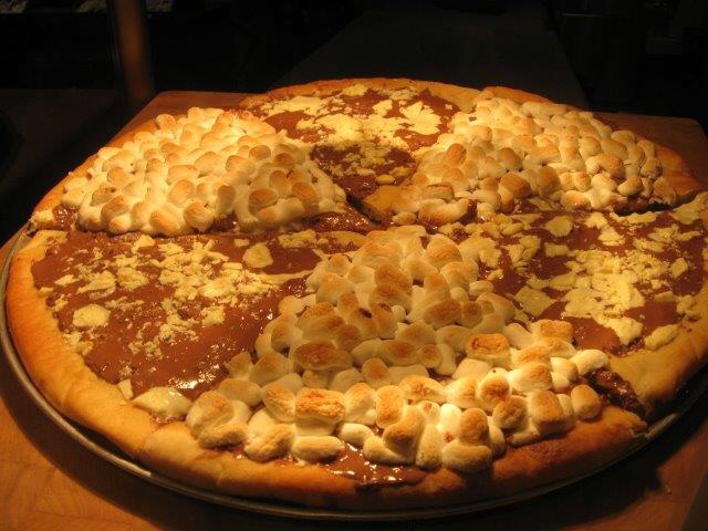Tienen pizza hecha de plátanos, nubes y chocolate. Nosotros tomamos una fondue de chocolate con nubes.