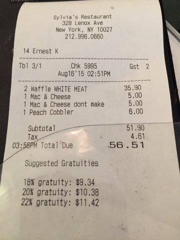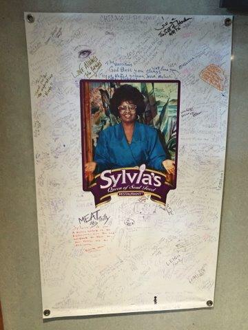 Sylvia’s está especializado en la “soul food”, que es la comida tradicional de los afroamericanos del sur de Estados Unidos. La base de este tipo de comida son las tres M: meat (carne), meal (harina, de maíz) y molasses (melaza). Una típica comida sería: mac & cheese, pollo frito, pan de maíz (cornbread) y de postre un banana pudding.